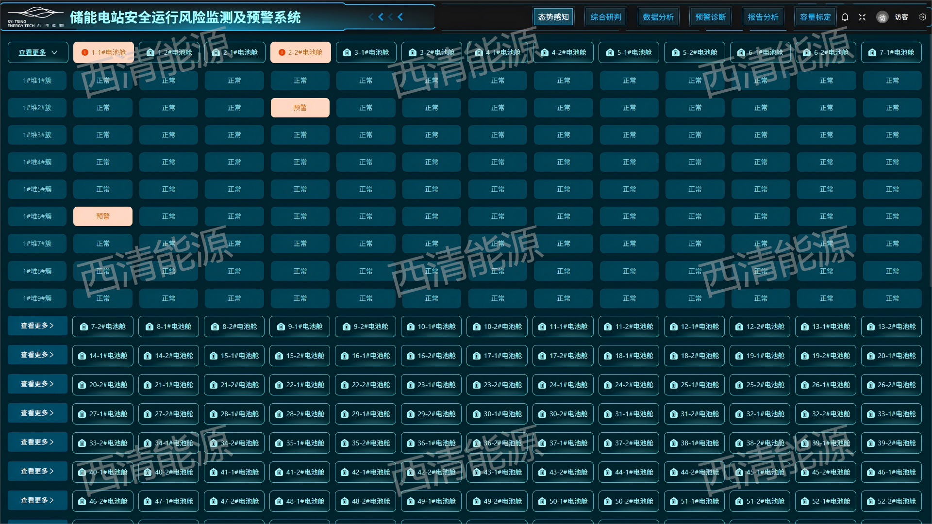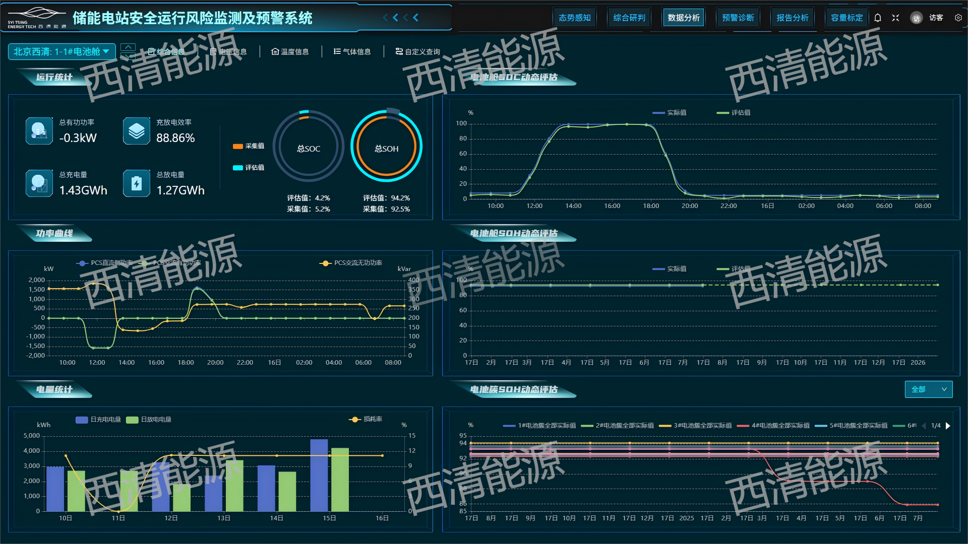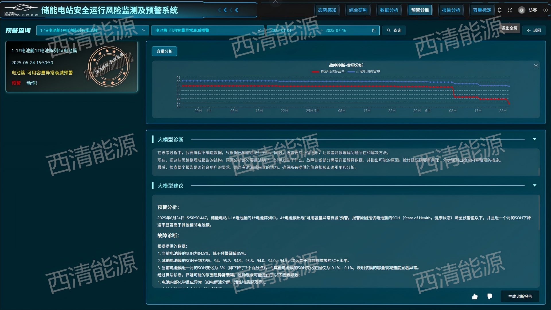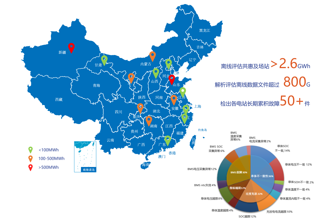 依据采集一定时间段可靠的电站离线数据,由北京西清能源科技有限公司通过人工智能的数据模式识别,发现安全风险隐患,分析特征参量的横向分布以及纵向演化,实现对储能电站设备性能与安全评价的定期技术监督。